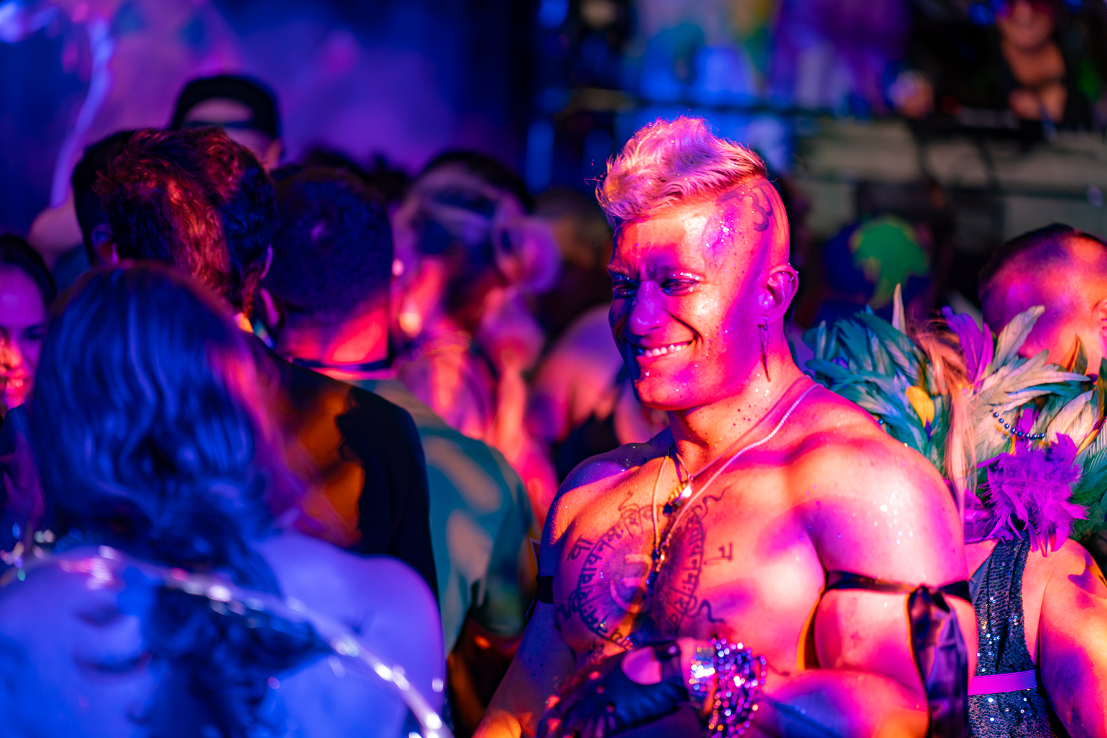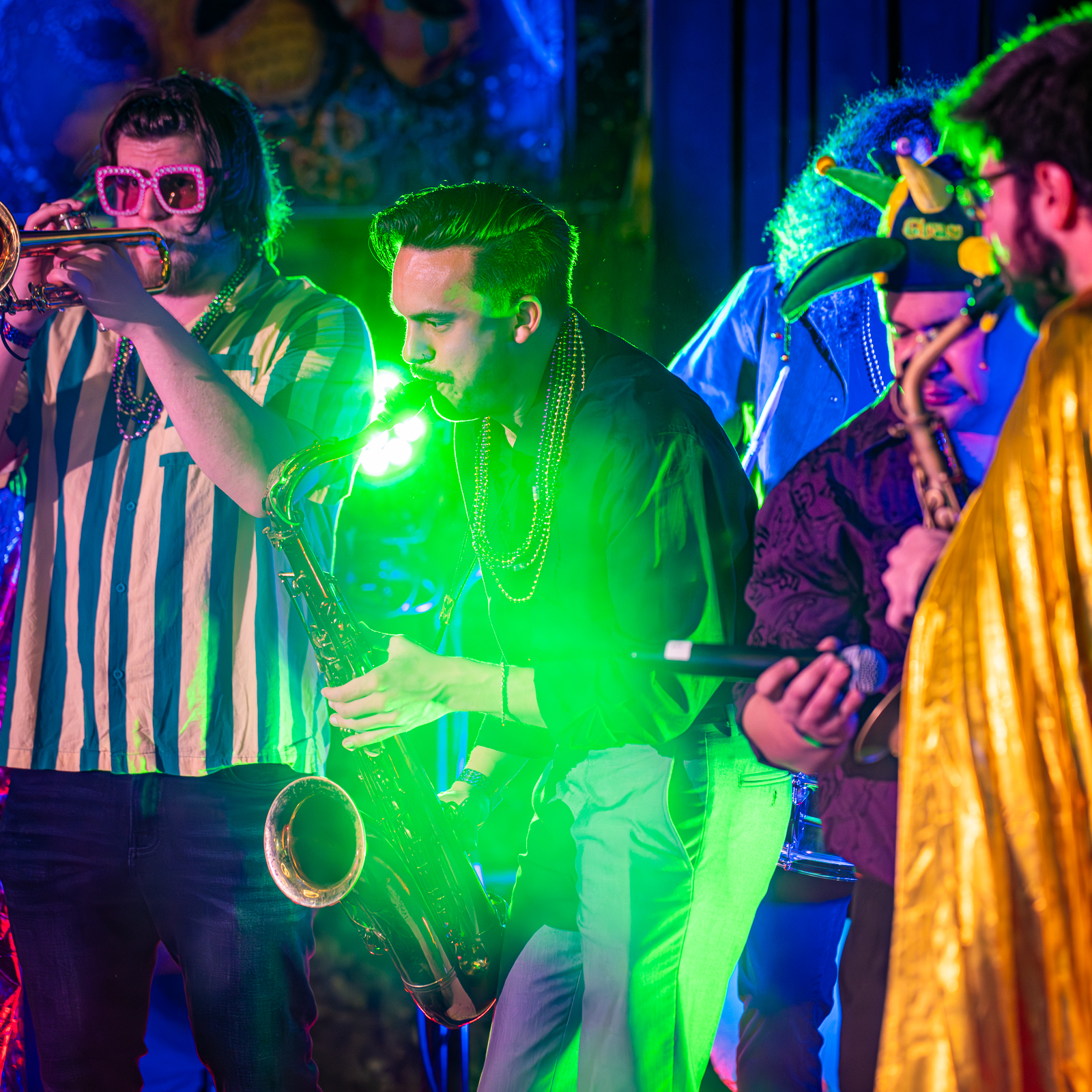 The spirit of Mardi Gras comes alive through a nonstop mix of horn lines and DJs. Classic brass-driven rhythms blend with modern dance anthems, creating a soundtrack that evolves as the night unfolds. Whether you’re front-and-center on the dance floor or soaking it in from above, the music keeps pulling you back in.